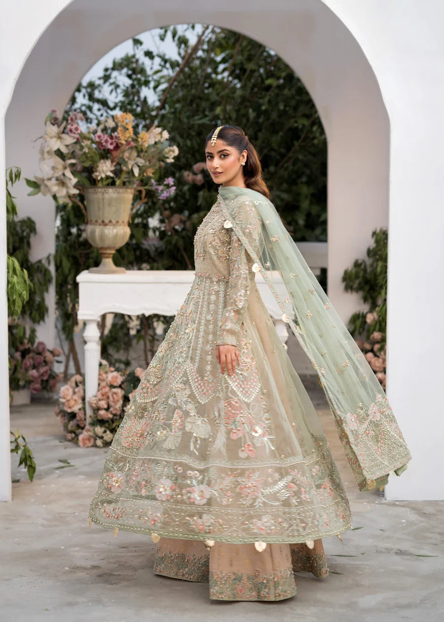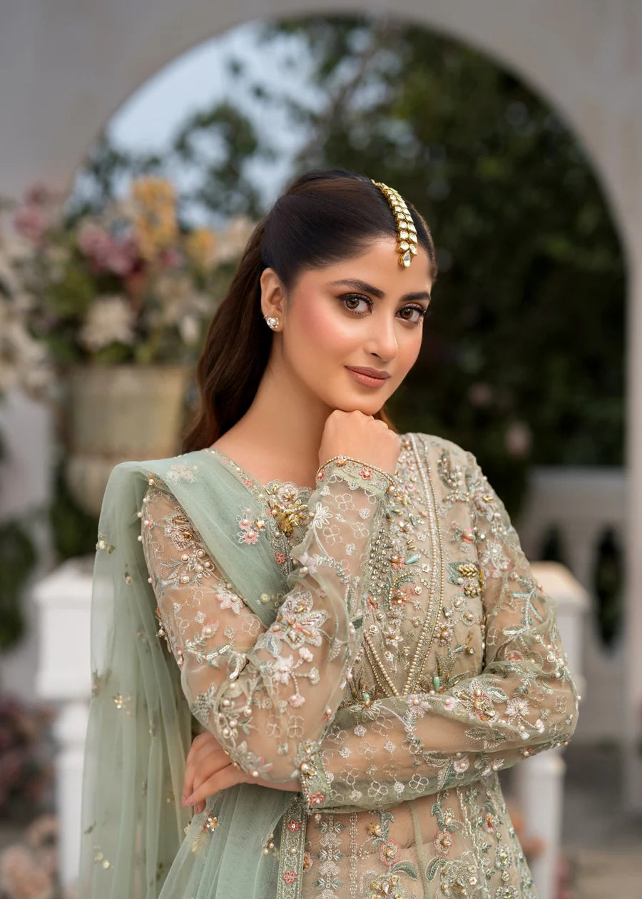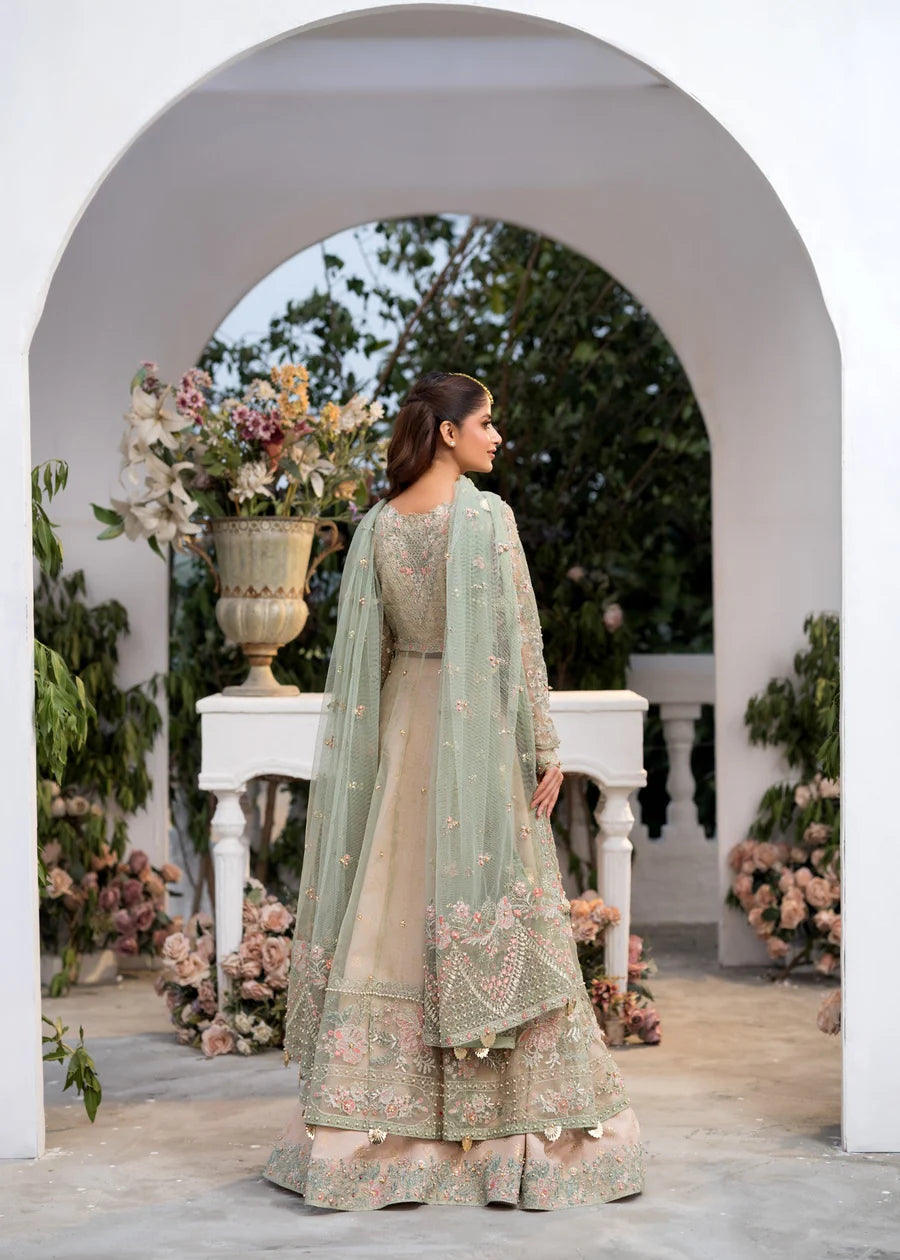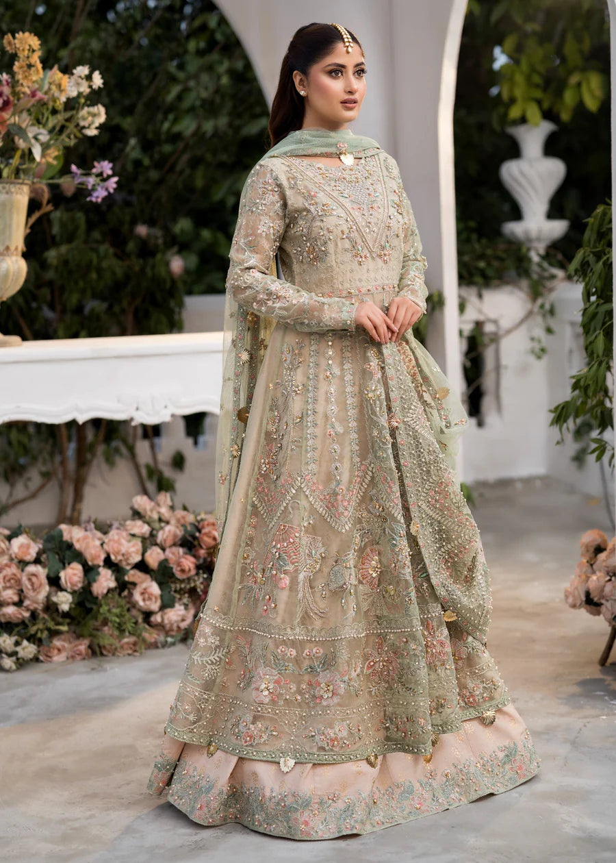 Additional Description: “1-Rival the intricate beauty and craftsmanship found in an organza maxi adorned with delicate embroidery, pearls, sequins, seashells, chain work, naqshi, and dabka work 2-Complementing this striking shirt is a net embroidered dupatta, meticulously crafted with pearls, sequins, and seashells 3-At the foundation of this captivating attire lies a raw silk lehenga enriched with screen printing, pearls, and intricate embroidery.