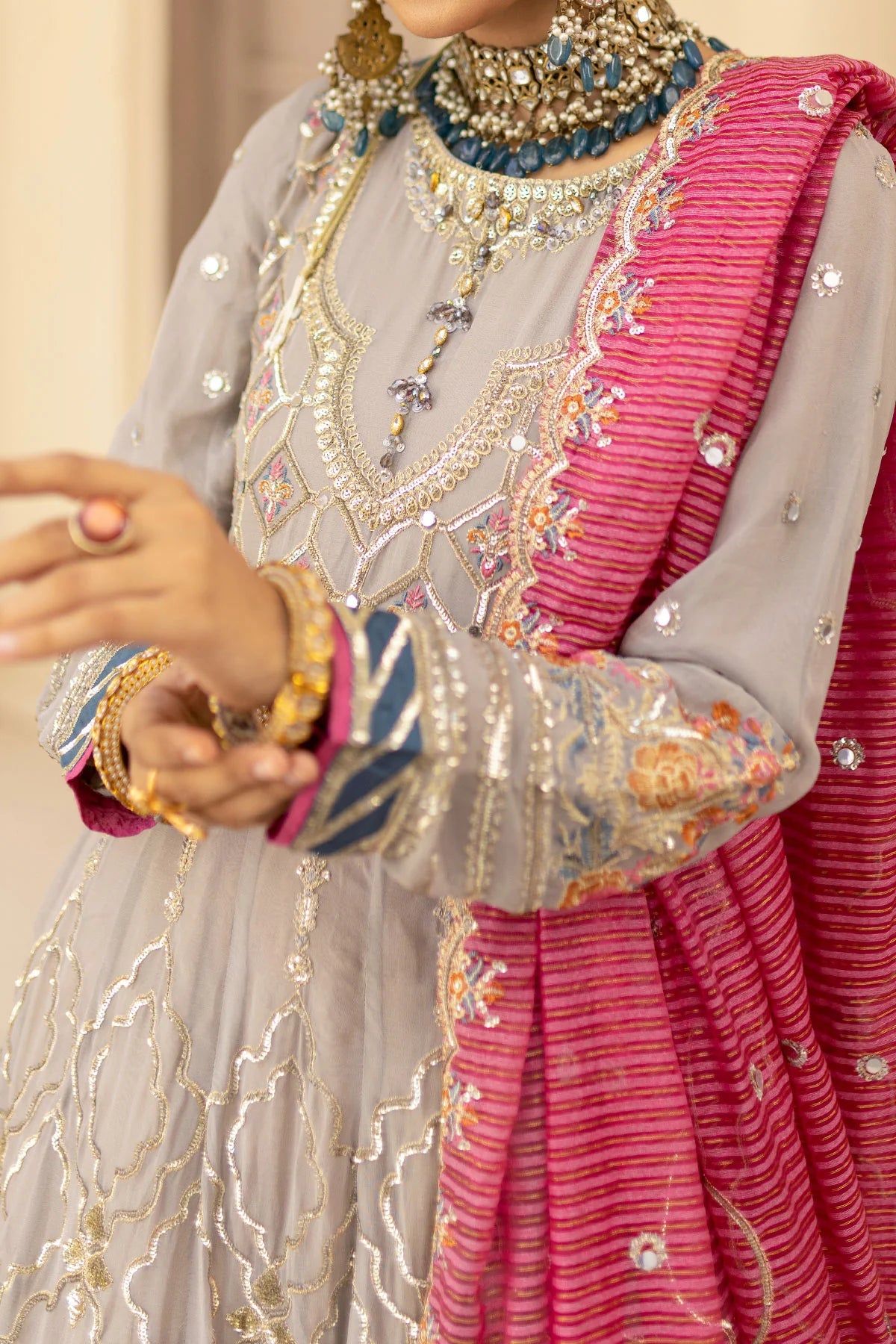 Unveil sophistication with this ensemble, a grey chiffon base design accented with colourful embroidery tones. The elongated maxi is adorned with intricate motifs of floral and geometric patterns, which is a testament to meticulous detailing. With an embellished neckline, full detailed sleeves, and a flared hemline, the maxi excludes understated elegance. The dupatta is crafted from a beautiful fabric adding a touch of glam,It's a statement of refined style that leaves a lasting.