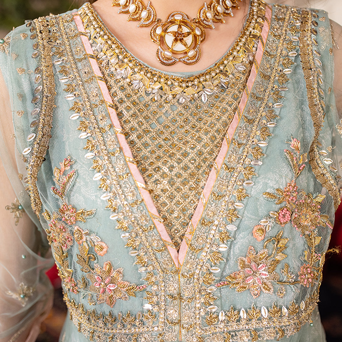 Shirt: Made with a Poly Net base, beautifully adorned with computer embroidery, thread, sequins, and pin pearls. The intricate hand-applied pearls, crystals, and Dabka work add a luxurious touch.