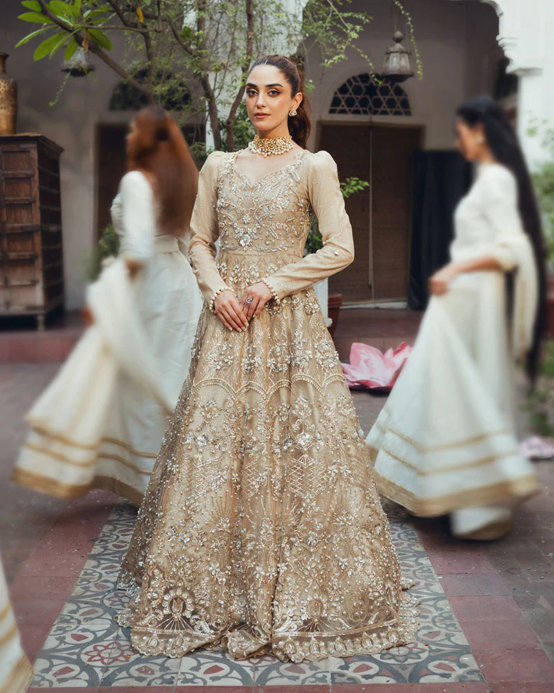 Additional Description: 1-Featuring of lush floras and diverse fauna with our 'shell' maxi Set, crafted for contemporary celebrations. Gleaming with intricate details of sequins, pearls, gotta, crystals, diamantes, dabka naqshi, hand-embellished 2-Our net dupatta, adorned with intricate pearl embellishments and bordered with delicate laces that exude charm and grace. 3-Finally we offer stylish viscose trousers that provide comfort without compromising on style.